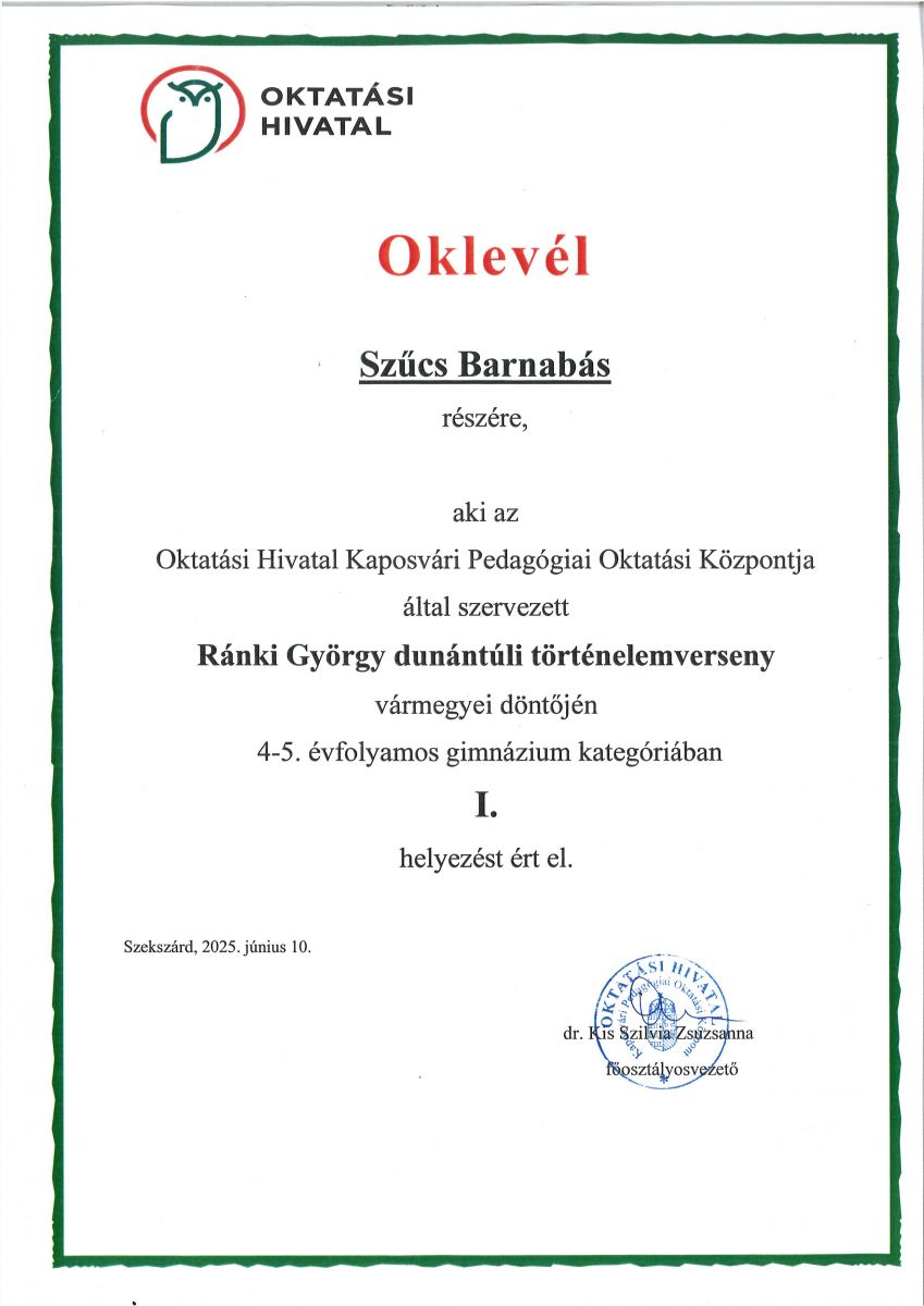 Iskolánkat Szűcs Barnabás 12.C osztályos tanuló és felkészítő tanára, Szunomár Szabolcs, akik a Ránki György Dunántúli történelemversenyen indultak, valamint a Vármegyei Középiskolai Biológiaversenyen első két helyet elhódító Babos Bence és Keresztes Boglárka Mercédesz 10.A osztályos tanulók képviselték, utóbbiak felkészítése Somogyvári Orsolya tanárnő érdeme.