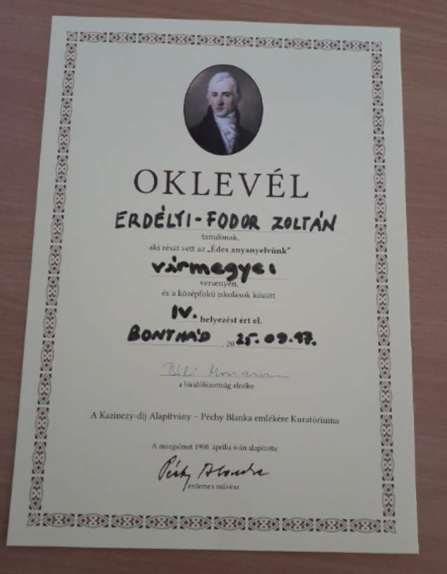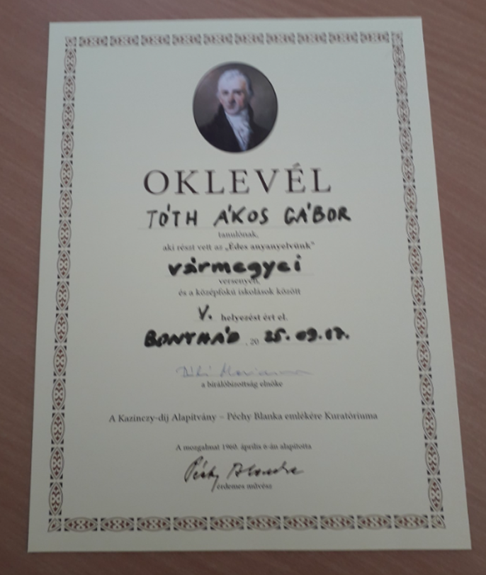 2025. 09.17-én az „Édes anyanyelvünk” nyelvhasználati verseny vármegyei döntőjében Bonyhádon gimnáziumunkat két tanuló képviselte: Erdélyi-Fodor Zoltán János (11. B) 4. helyen, Tóth Ákos Gábor (12. C) 5. helyen végezett a szoros küzdelemben.